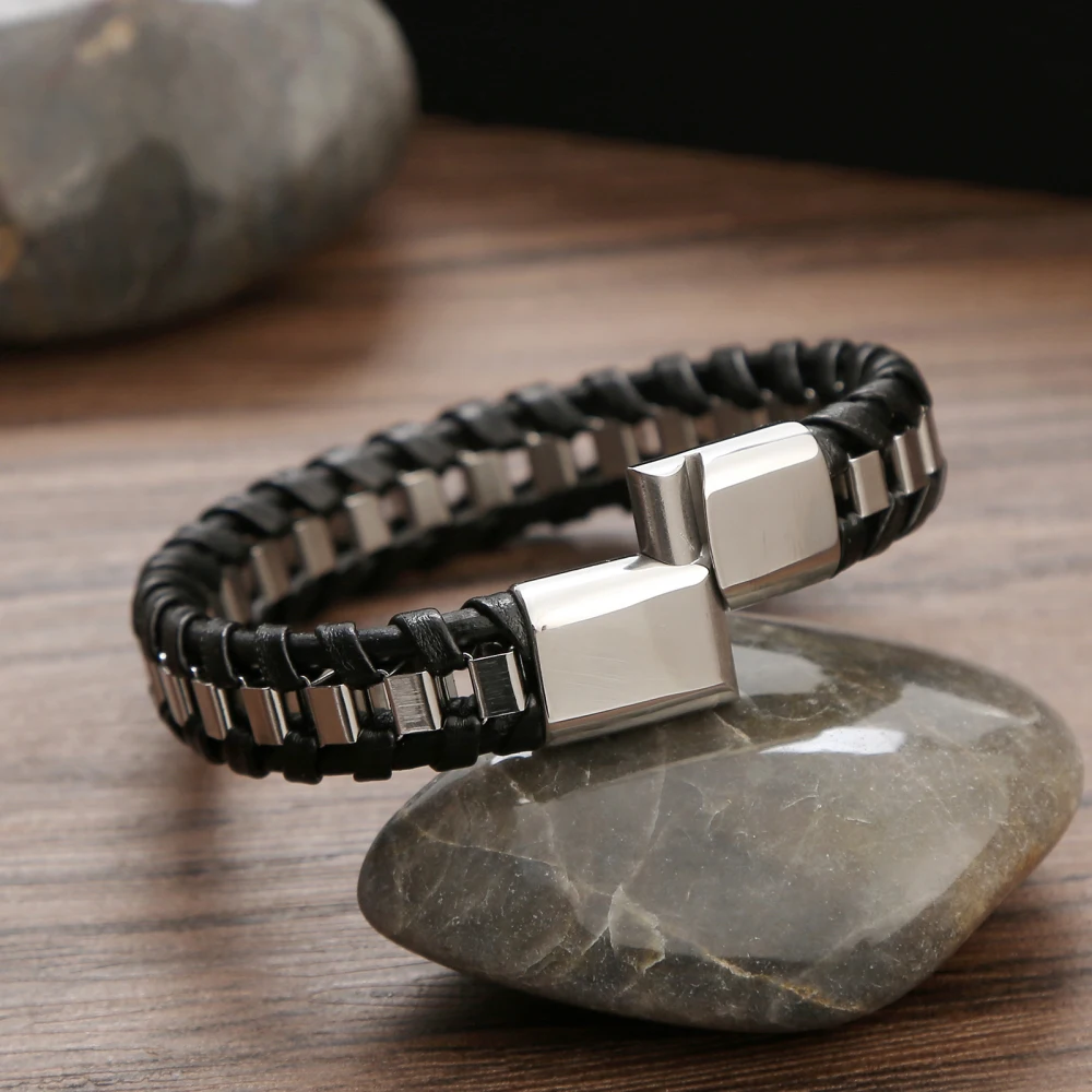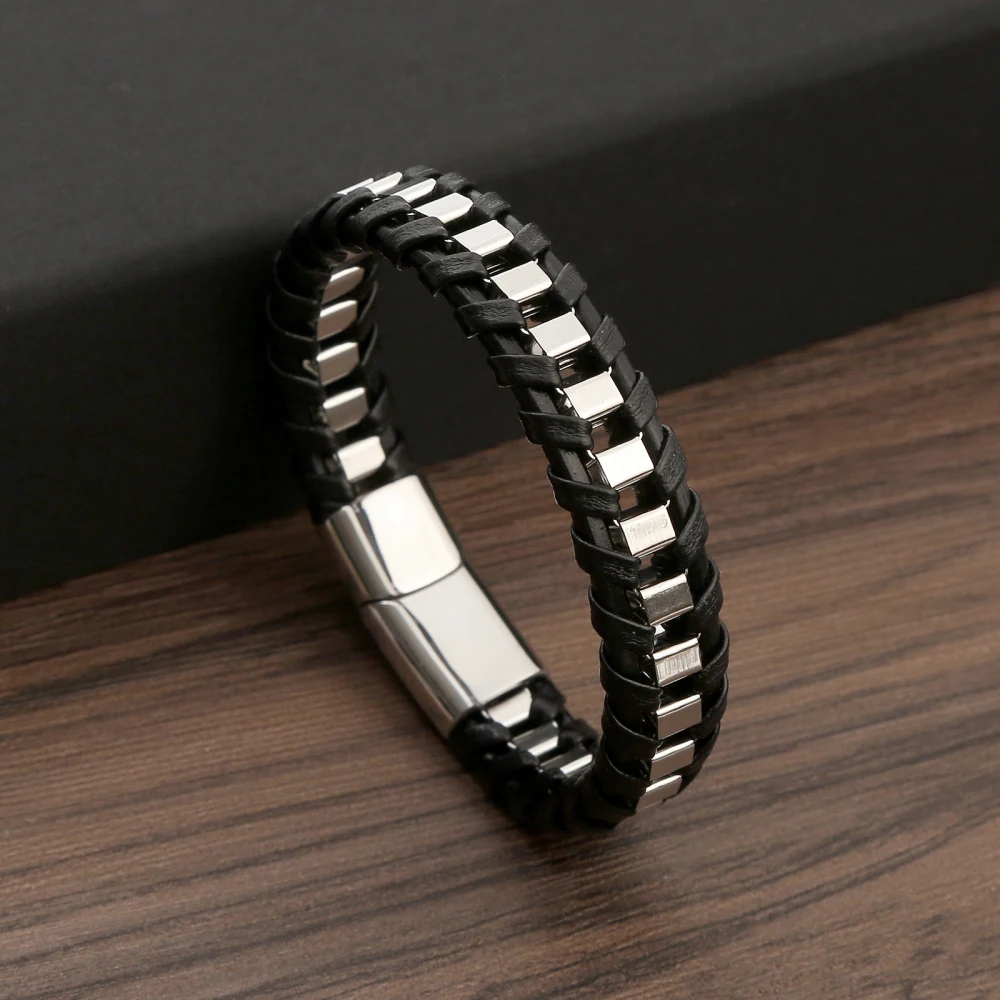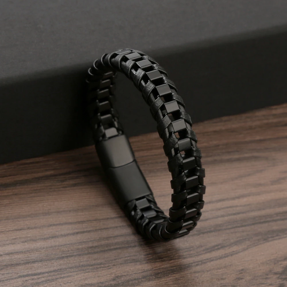 • Tipo: Pulseira Masculina • Estilo: Moderno / Fashion / Urbano • Material: Couro sintético trançado • Detalhes: Aço inoxidável resistente • Cor: Preto com detalhes metálicos • Fecho: Magnético / Encaixe de segurança • Gênero: Masculino • Peso: Leve e confortável • Indicação de uso: Dia a dia, eventos e lazer